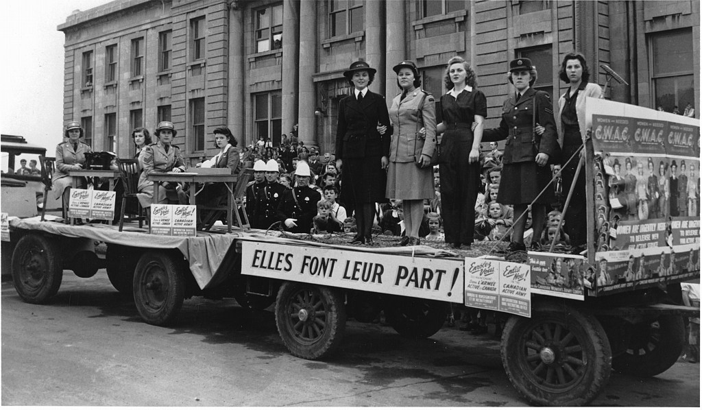 The army approached the prospect of including women with much hesitation. Originally, National Defence headquarters, which employed 1,325 civilian women, hoped they would join the Canadian women’s army corps or CWACs, providing most of the 1,500 women the army thought were required in 1941. By March 1942, as voluntary recruitment of men declined, the target was raised to 5,000, so that A-category men could be released for overseas service. When women proved to be of great value, they were taken directly into the army rather than an auxiliary service and a vigorous recruiting campaign began. By July 1943, 70,000 thousand women had visited a recruiting office, but just 37,000 agreed to be medically examined, and only 28,000 were accepted. While recruiting ads were placed in French-language newspapers, no provision for English-language training was made until 1944, and no French-language units were created. The CWAC officer training school at Saint Anne de Bellevue, on the western edge of Montreal, functioned entirely in English. At the end of the war, 11,706 CWACs were serving in Canada and 853 in Britain. Almost all served as a clerk, stenographer, or kitchen and laundry worker which may account for the drop-out rate, and the general view that joining the army was not really performing a vital war service.[23]