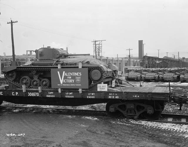 Armoured Fighting Vehicles, especially the British-designed Valentine tank, became an important part of Montreal’s contribution to the Allied war effort. The Canadian Pacific Railway’s Angus shops received an order for 300 Valentines in June 1940 and eventually 1300 were produced. Almost all were sent to the Soviet Union as part of the American Lend-Lease program. A Canadian version of the American M3, the Ram, was manufactured by the Montreal Locomotive works using engines and transmissions imported from the United States. Unionization was limited to skilled trades, but competition for workers forced companies to raise all wages.[14]
